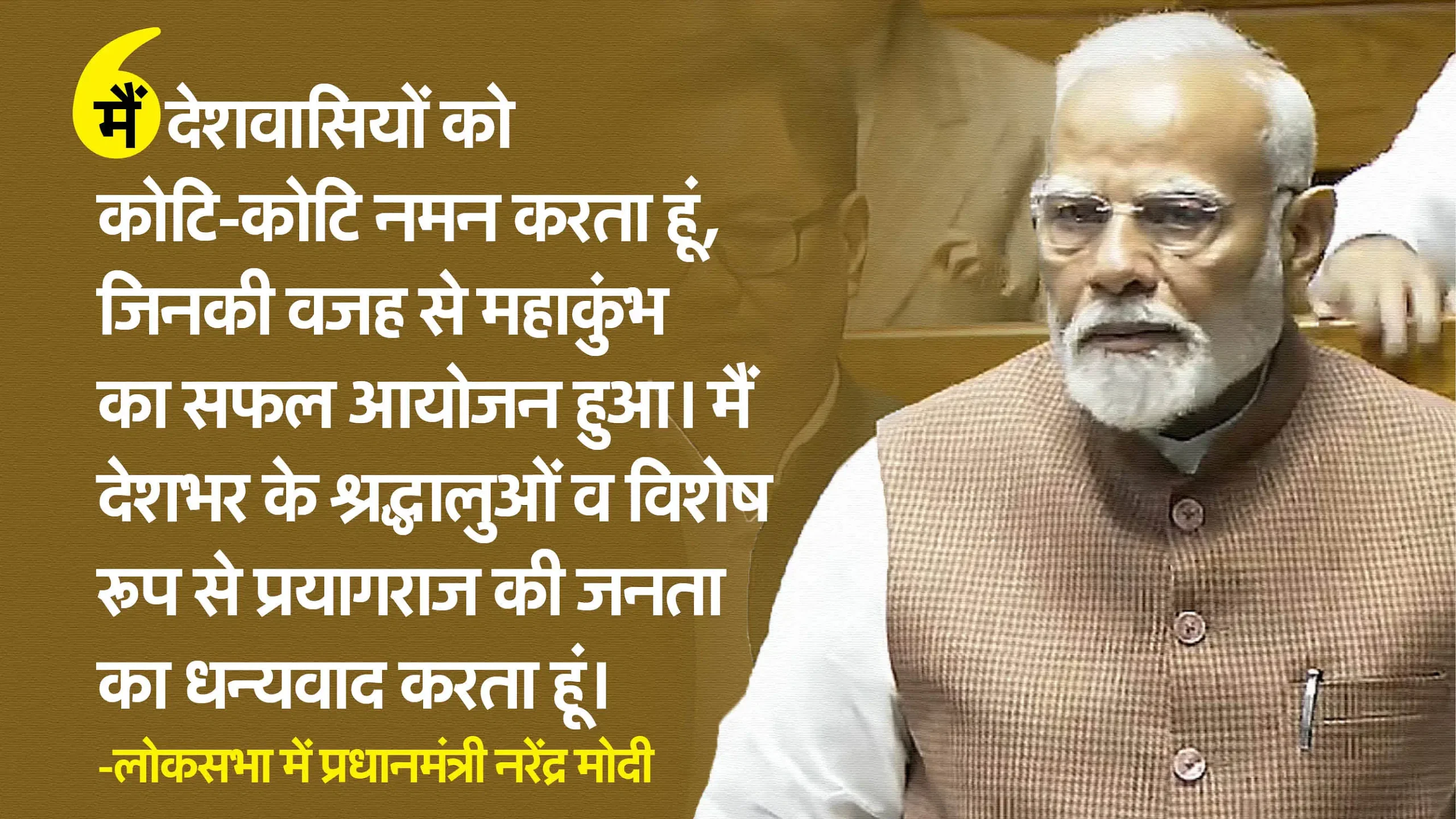 पीएम मोदी मंगलवार को लोकसभा में महाकुंभ के आयोजन पर बोले। उन्होंने इस दौरान इस आयोजन में योगदान देने वालों का धन्यवाद किया।प्रधानमंत्री मोदी ने कहा, ‘‘आज मैं इस सदन के माध्यम से देशवासियों को नमन करता हूं जिनकी वजह से महाकुंभ का सफल आयोजन हुआ है। महाकुंभ की सफलता में अनेक लोगों का योगदान है.. मैं सभी कर्मयोगियों का अभिनंदन करता हूं। मैं देश भर के श्रद्धालुओं, उत्तर प्रदेश व विशेष रूप से प्रयागराज की जनता का धन्यवाद करता हूं।”पीएम ने कहा कि पिछले वर्ष अयोध्या के राम मंदिर प्राण प्रतिष्ठा समारोह ने हम सभी को यह अहसास कराया कि देश अगले 1000 वर्षों के लिए कैसे तैयार हो रहा है। इस वर्ष महाकुंभ ने हमारी सोच को और मजबूत किया है, तथा देश की सामूहिक चेतना हमें देश के सामर्थ्य के बारे में बताती है।पीएम ने कहा, “मानव जीवन के इतिहास में ऐसे कई मोड़ आते हैं, जो पीढ़ियों को दिशा देते हैं।” पीएम मोदी ने महाकुंभ पर बोलते हुए कहा कि आयोजन के दौरान लोग सुविधा-असुविधा की चिंता छोड़कर इसमें शामिल हुए। पीएम ने कहा कि पीढ़ी दर पीढ़ी हमारे संस्कारों के आगे बढ़ने का क्रम जारी है। आज भारत का युवा अपनी परंपरा अपनी आस्था और परंपरा को गर्व के साथ अपना बना रहा है। एक देश के रूप में हम बड़े लक्ष्यों को प्राप्त करने का भरोसा बढ़ा। अपने विरासत से जुड़ने की परंपरा आज के भारत की सबसे बड़ी पूंजी है।